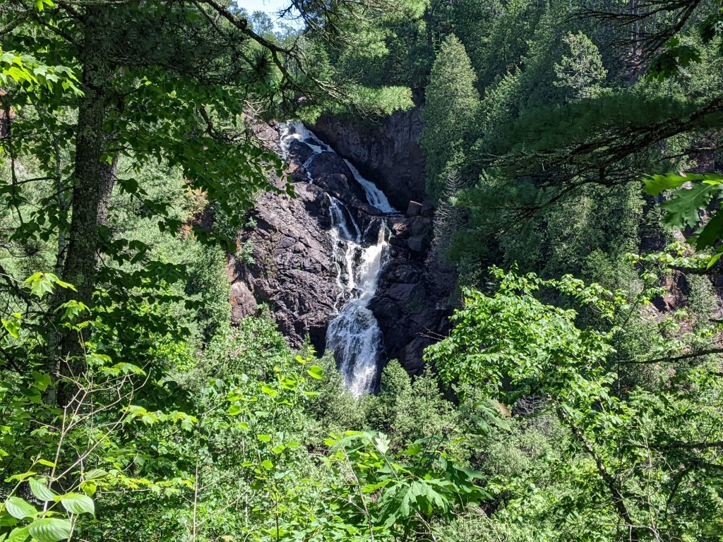 I don’t typically use proper nouns in my poetry, so this was an interesting challenge! Like with yesterday’s poem, I again took inspiration from my family’s recent camping trip and decided to write about a waterfall we visited on one of our hikes. Big Manitou Falls is the largest waterfall in Wisconsin, at 165 feet. There is also a Little Manitou Falls a few miles upstream, with a much smaller 30-foot drop. We didn’t visit the little falls due to a car full of tired children following their long hike on small legs to see the bigger falls (we ended up carrying the smaller two halfway), but Big Manitou made for some pretty pictures, a fun stretch on our ride back from Duluth, and– of course– another opportunity for rock skipping. 😀